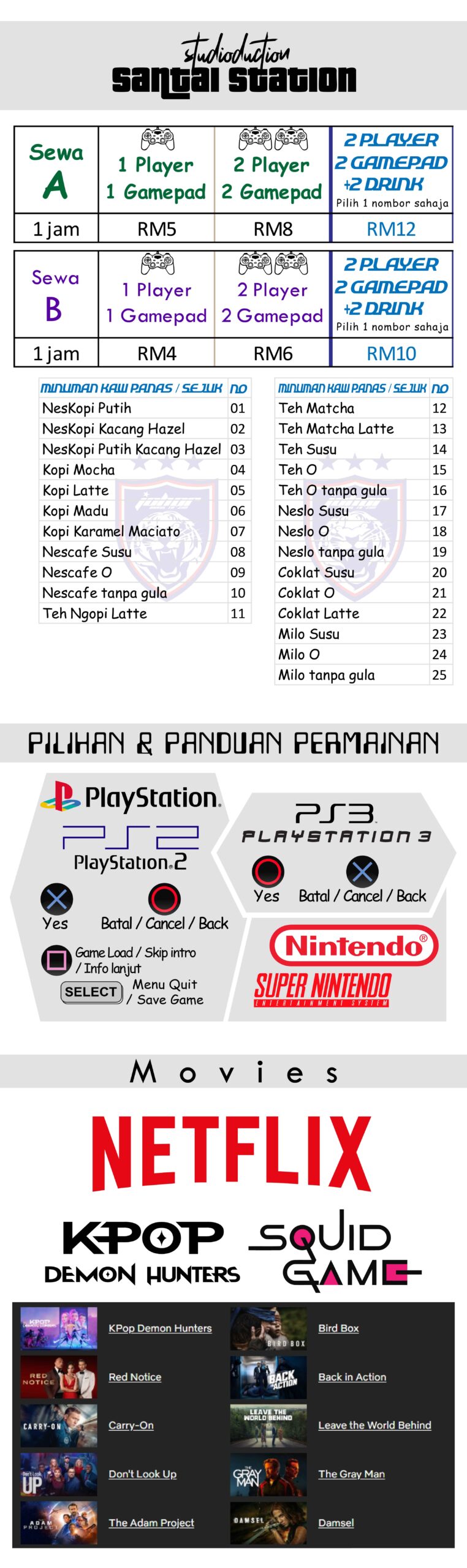 Mari santai-santai healing kat sini macam rumah sendiri!Nak main game dengan kawan atau..Tengok movie khas dari platform Netflix, movie baru & lain-lain cerita pon ada katSantai Station eSports (SQuad/S4)